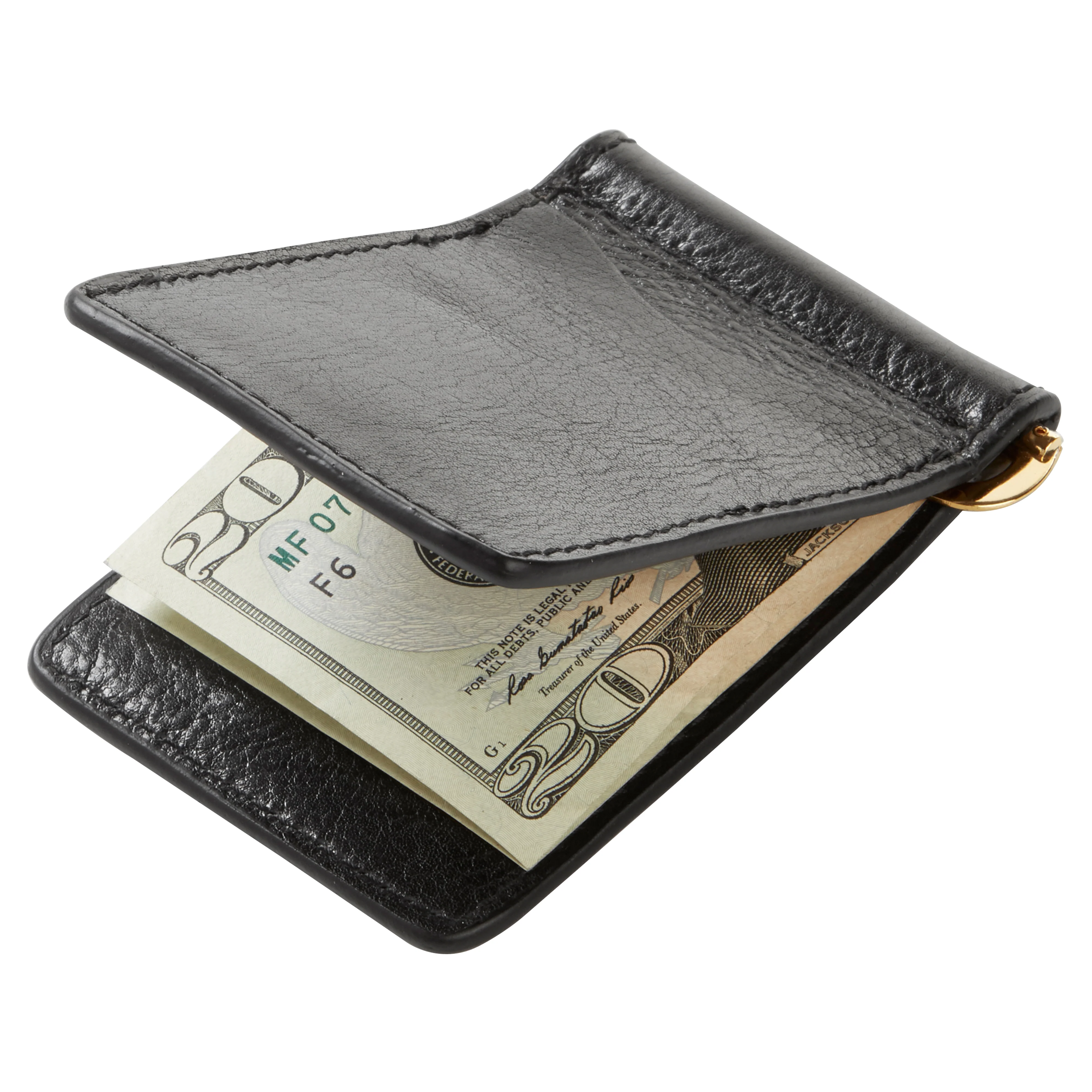 The slim design of this handsome glazed leather money clip is perfect for the minimalist. Brass money clip secures currency, receipts, etc. Two exterior pockets, one on each side, secures ID and credit cards. Leather lined interior.